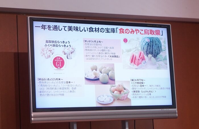 セミナーでは鳥取県の方が「一年を通して美味しい食材の宝庫”食のみやこ鳥取県”」ともおっしゃってて、鳥取砂丘らっきょうやスイカ、梨などをご紹介されてました。